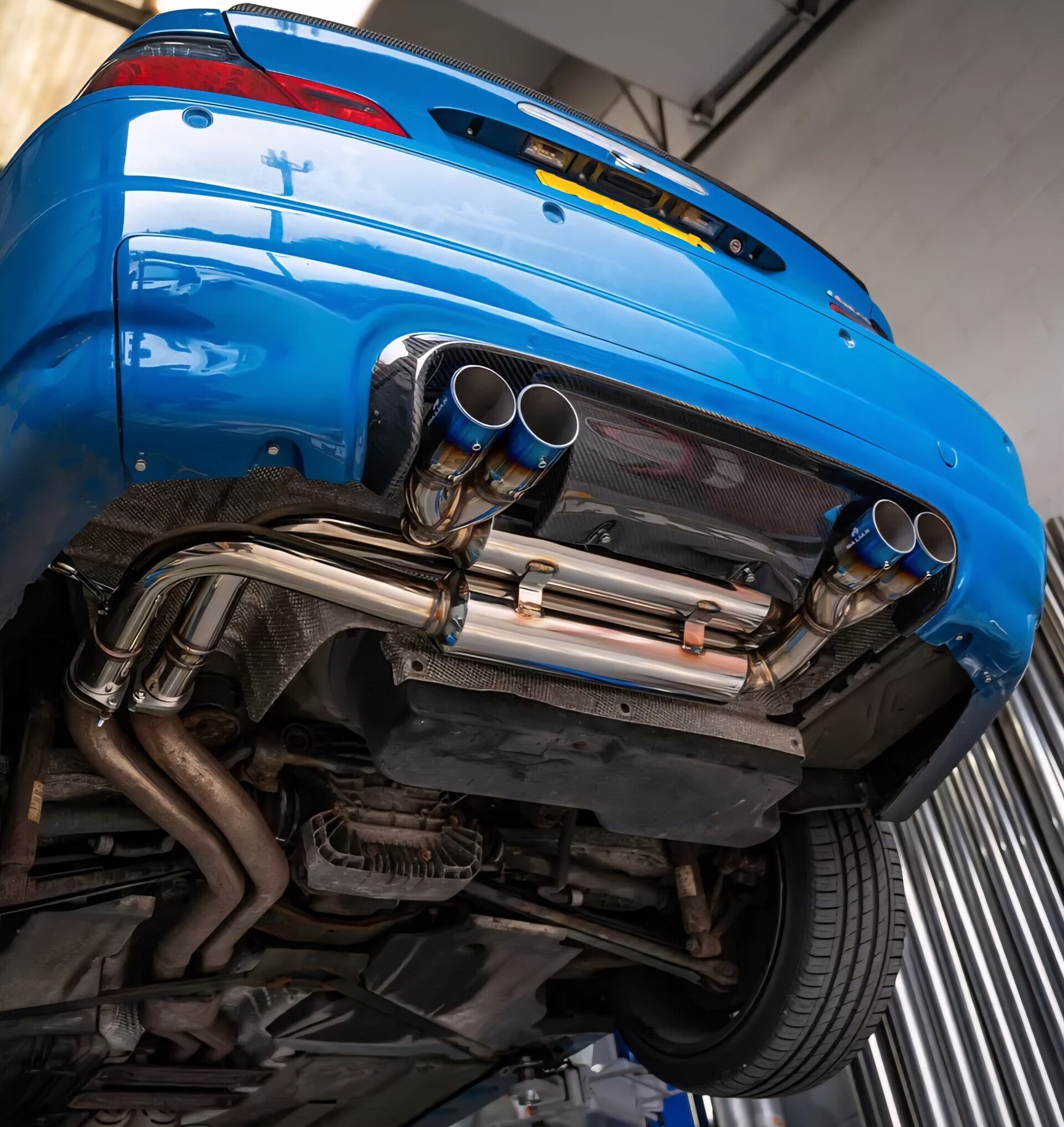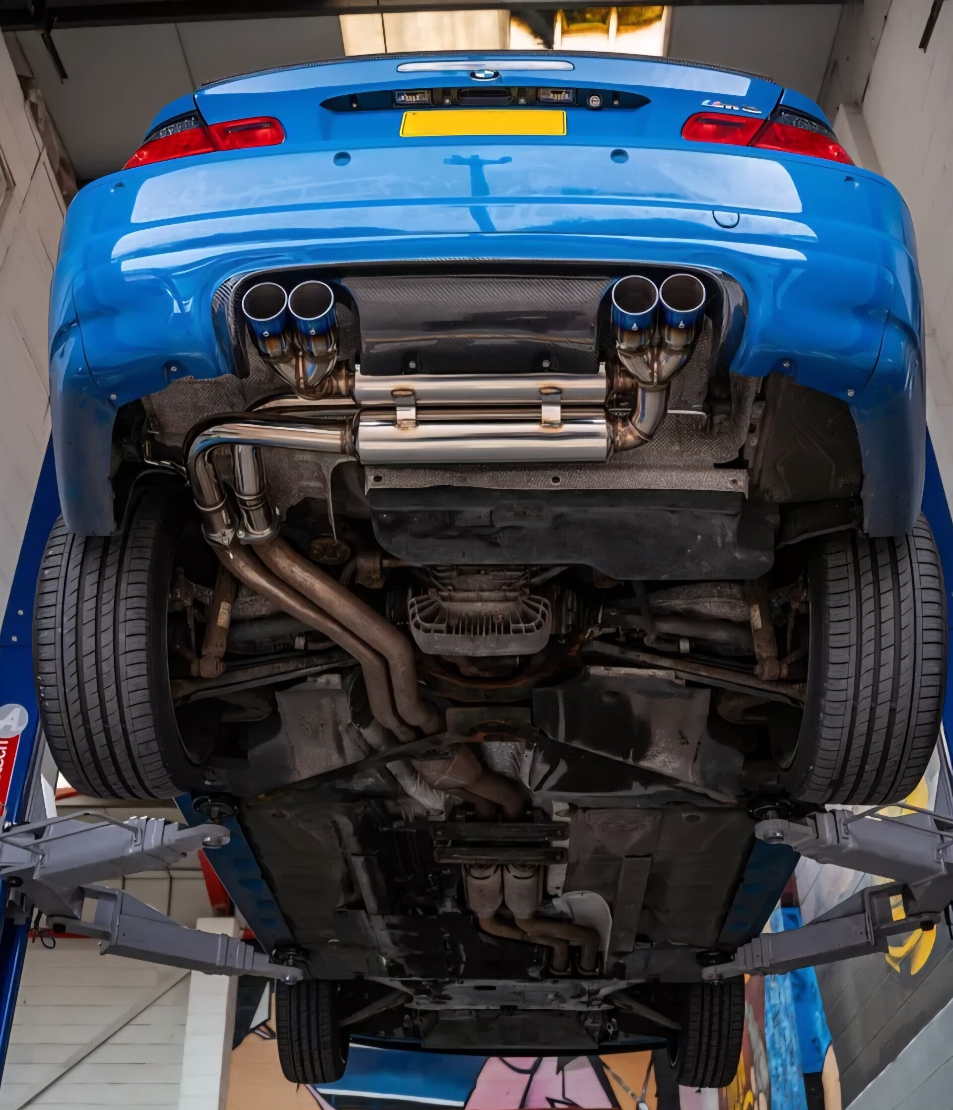 RVS SPORT DEMPER MET TITANIUM BLAUWE EINDTIPS BMW E46 M3 3.2L S54B32 2001+